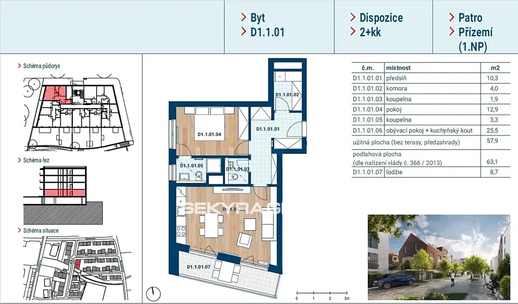 Dovolujeme si Vám nabídnout k prodeji byt 2+kk o výměře 63,1 m² s lodžií 8,7, m² v rezidenčním projektu Rezidence Čakovice.
