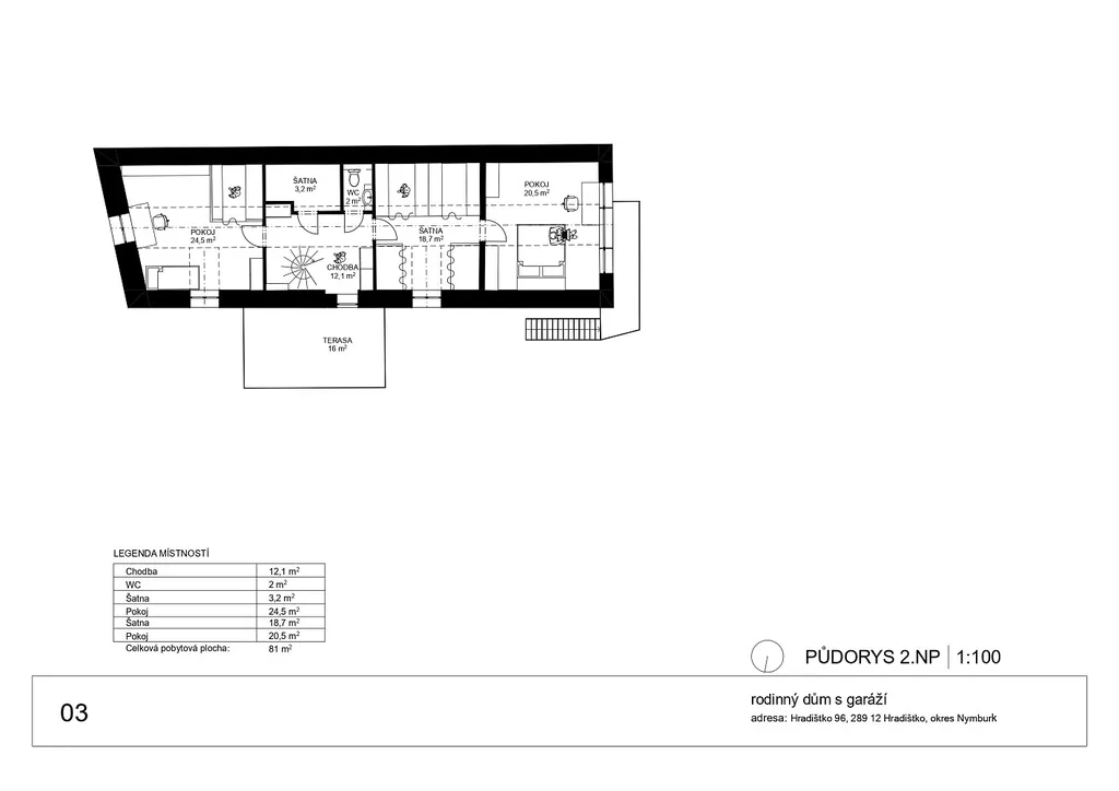 V prvním patře se nachází 2 pokoje, WC, malá šatna a velká průchozí šatna, která může sloužit jako další pokoj.
