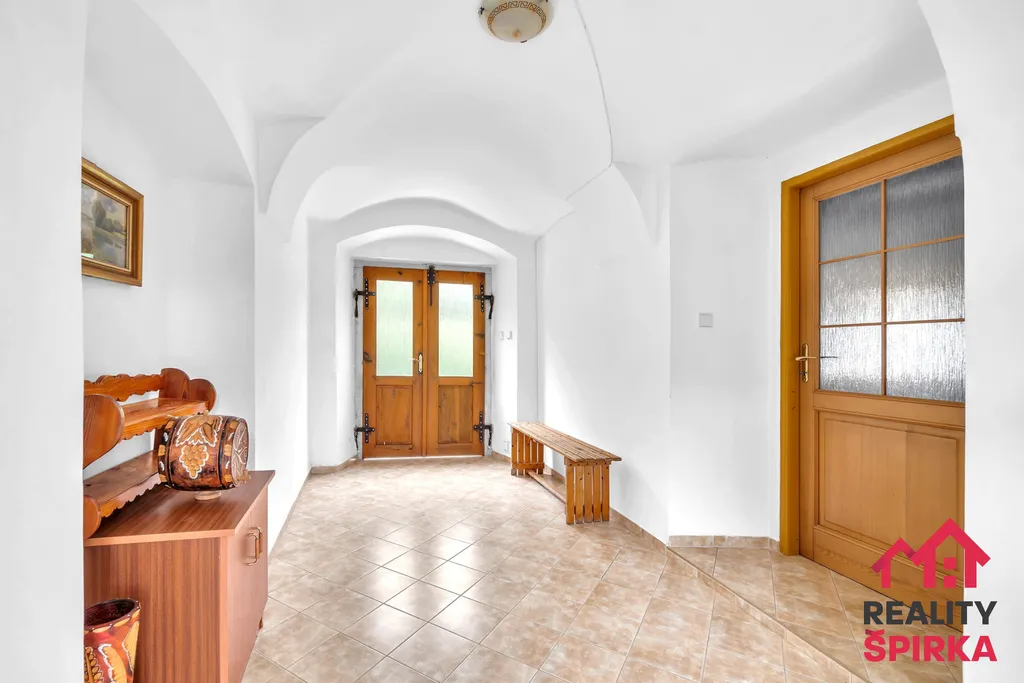 2+kk s velkorysou místností se stylovými krovy – kuchyň, jídelna a obývák v jednom, samostatný pokoj, krb s rozvody tepla, koupelna se sprchovým koutem, samostatné WC, chodba, spíž.