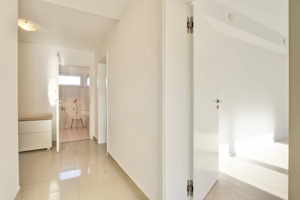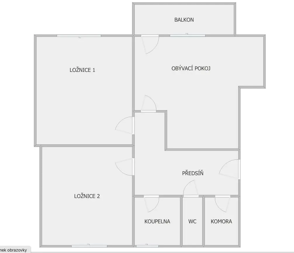 Obývací pokoj s kuchyňským koutem, balkon a jedna z ložnic jsou orientovány na jih, druhá ložnice je prakticky umístěna na sever.