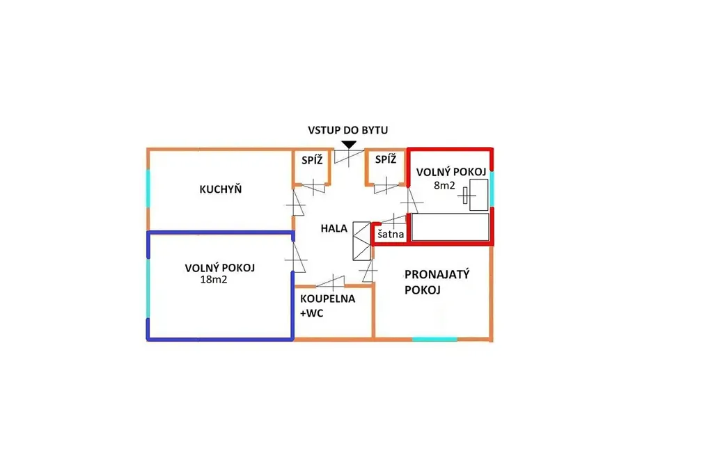 V pokoji je široká postel a úložné prostory. Nájemce si může pokoj dovybavit vlastním nábytkem. Společná je kompletně vybavená kuchyň včetně myčky a lednice, koupelna včetně pračky a ostatní prostory.K dispozici jsou úložné prostory. V bytě budou celkem 3 nájemci-muži.