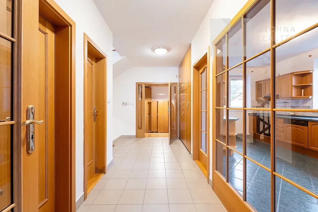 Dominantou domu je prostorný obývací pokoj s krbem, který je přirozeným centrem celého domu a navazuje na jídelní část i kuchyni. Interiér působí vzdušně, nadčasově a nabízí možnost dalšího individuálního doladění dle vkusu nového majitele.