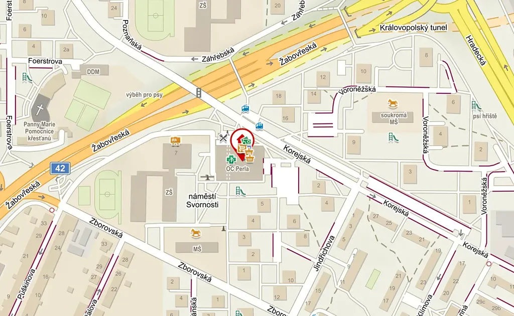 Lokalita: OC Perla, náměstí Svornosti, Žabovřesky – Brno