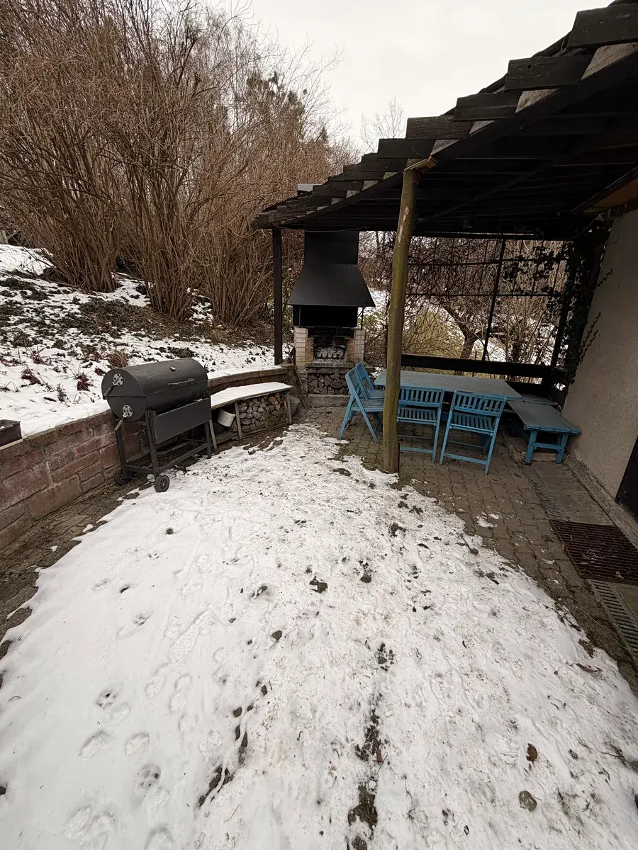 Před chatkou je posezení s krbem, bazén a rozlehlý prostor se spoustou zeleně, který zaručuje klid a pohodu při relaxaci.