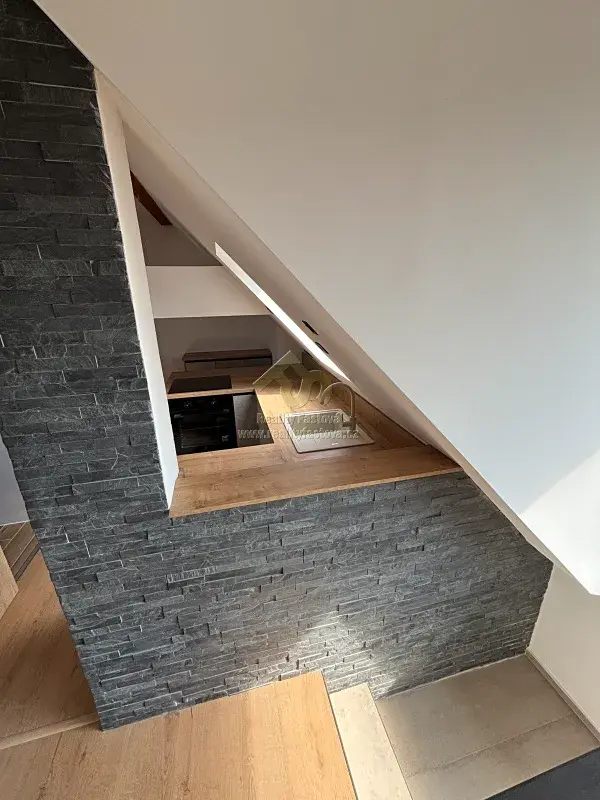 Do obytné části se vystupuje do patra po schodišti s designovým kovovým zábradlím. Otevře se před vámi krásný a prosvětlený podkrovní byt, o vel. 2+kk. Vlevo obývací pokoj s krbovými kamny, který při chladnějším počasí vykouzlí romantické večerní teplo. Uprostřed bytu je kuch.kout s vestav.spotřebiči el.sporák s troubou, digestoří a myčkou. V krásné a prostorné koupelně je vyzděný sprchový kout, umyvadlo a toaleta. Vedle kuchyně se dále nachází samostatný pokoj.