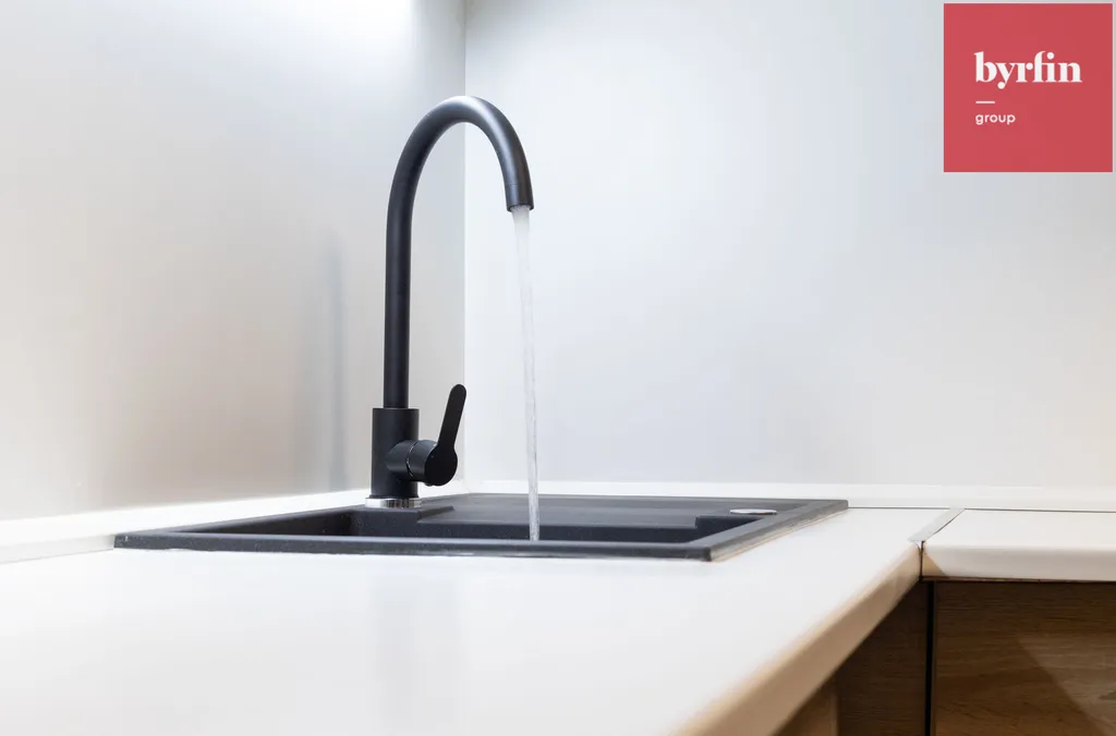 V kuchyni granitový dřez s baterií, myčka, trouba a varná deska. Digestoř pro odvod par je svedena do komína.