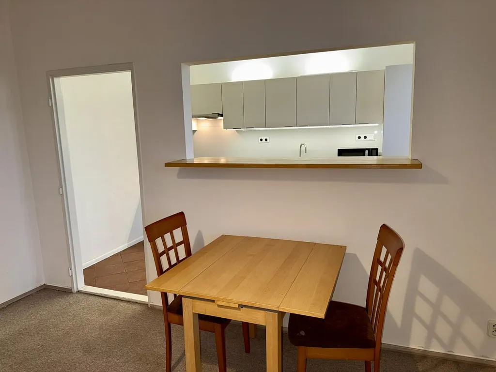 Byt má praktickou dispozici z kuchyně je vstup do obývacího pokoje přes dveře, kuchyně je zároveň propojena s obývacím pokojem servírovacím oknem. V kuchyni je vestavěná myčka nádobí, lednice s mrazákem, indukční varná deska, mikrovlnná trouby, digestoř. Dva další pokoje jsou samostatné. Součástí bytu je také komora s dostatkem úložného prostoru a přípojkou na pračku a sušičku.
