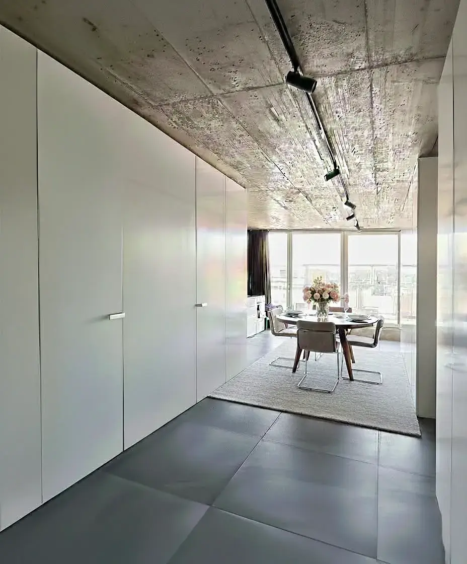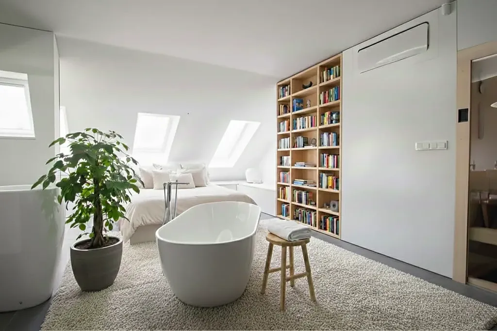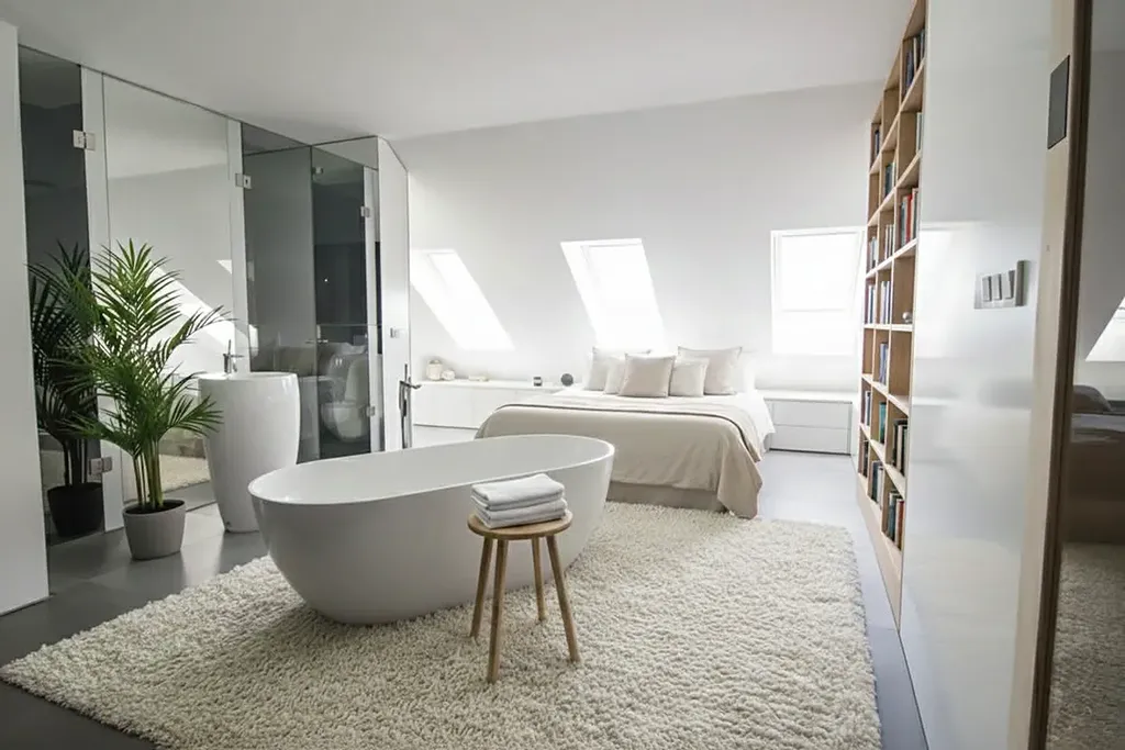 Interiér bytu je navržen s důrazem na funkčnost a elegantní design. V bytě naleznete dvě samostatné toalety a dva sprchové kouty, doplněné o vanu umístěnou volně v prostoru, což vytváří atmosféru lázní. Koupelna je osvětlena pomocí moderního napínaného stropu Barisol, který zajišťuje dokonale hladký povrch a rovnoměrné rozptýlené světlo a je odolný vůči vlhkosti.