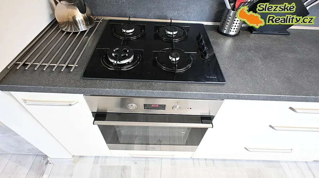Srdcem bytu je moderní kuchyňská linka s kováním Blum, vybavená vestavnými spotřebiči – sporákem, myčkou nádobí, lednicí a pračkou (pračka je umístěna v koupelně).