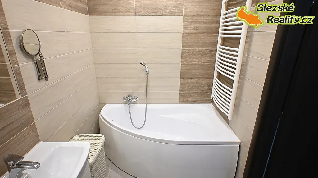 Koupelna je řešena novým bytovým jádrem, disponuje vanou, větráním a přístupem denního světla. Toaleta je samostatná a designově sladěná s koupelnou.