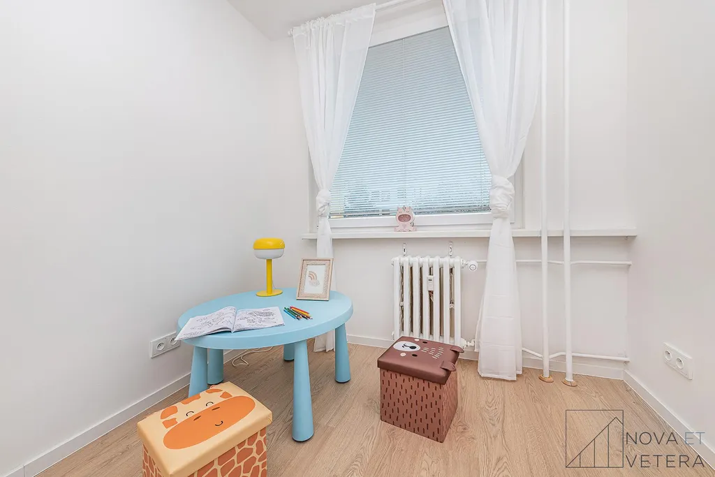 Dispozičně byt nabízí prostorný obývací pokoj s kuchyňským koutem a vstupem na lodžii o velikosti 5,5 m², tři samostatné pokoje vhodné jako ložnice, dětský pokoj či pracovna, moderní koupelnu se sprchovým koutem a samostatnou toaletu. Dostatek úložného prostoru zajišťuje prostorná vstupní chodba, k dispozici je rovněž samostatná místnost využitelná jako šatna či komora. K bytu náleží sklepní kóje o velikosti 1 m² v suterénu. Ke společnému užívání je dále k dispozici kolárna/kočárkárna v přízemí domu. K bytu je možné si pronajmout parkovací stání, což výrazně zvyšuje komfort bydlení v této lokalitě.