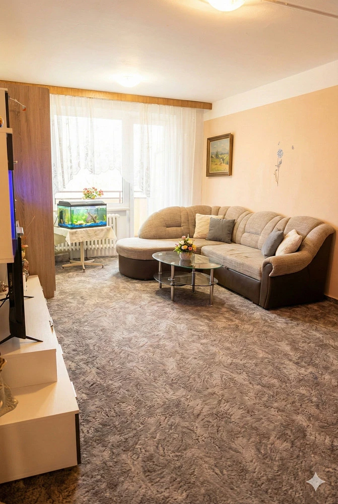 Dispozice 1+1 zahrnuje prostorný obývací pokoj a oddělenou kuchyni, což vytváří pohodlné a funkční bydlení. Byt je příjemně světlý díky jeho orientaci.