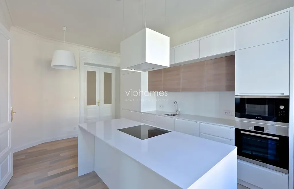 Interiér bytu o velikosti 137 m2 tvoří moderně propojený obývací pokoj s kuchyní, 2 prostorově velkorysé ložnice, 2 minimalisticky pojaté koupelny s toaletou a technické zázemí Dřevěné dubové, pračka/sušička, vestavěné skříně, nová okna s dvouvrstvým sklem, internet. Byt je kompletně zařízený.