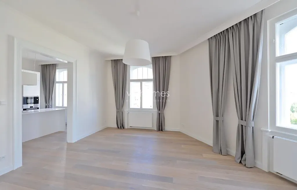 Moderní designový byt ve 3. patře kompletně zrekonstruované činžovní budovy v secesním stylu, v jedné z nejžádanějších částí Prahy, přímo na Náměstí Jiřího z Poděbrad. Budete okouzleni výhledem na avantgardní architektonickou stavbu kostela Nejsvětějšího srdce Páně, osobité dílo slovinského architekta Jože Plečnika a celé náměstí s typickou energií a atmosférou Vinohrad. Najdete zde jak významná nákupní centra např. Palác Flóra a Vinohradský pavilon pro Vaše pohodlné nákupy, tak i divadla (Divadlo na Vinohradech, Smetanovo divadlo), parky a vyhlídky, možnosti k posezení v četných restauracích a kavárnách. Díky výhodnému dopravnímu spojení se brzy dostanete do samotného centra města, ale i za jeho hranice, a to jak automobilem tak MHD. Stanice metra A .