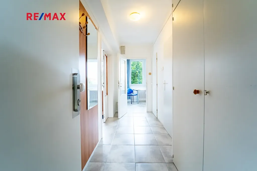 Bytová jednotka 1+1, po rekonstrukci (elektřina, odpady), se nachází ve 4. patře z 12 pater s výhledem do zeleně (školka). Dispoziční řešení: kuchyň s jídelnou, prostorná místnost, chodba s úložným prostorem a koupelna s oddělenou toaletou.
