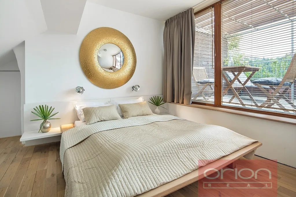 Nabízíme k pronájmu mezonetový byt 2+kk s terasou v 5. patře zrekonstruovaného domu z 19. století v Praze 5. V domě je výtah. Zařízený byt o rozloze 55 m2 nabízí ve spodním patře kuchyň plně vybavenou všemi spotřebiči, koupelnau, šatnu a obývací pokoj, v horním patře je pak ložnice se vstupem na terasu. K vybavení bytu patří klimatizace, TV/SAT/WIFI.