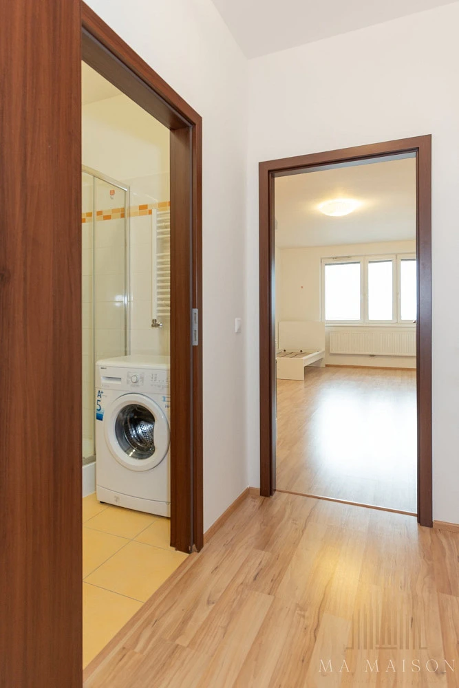 Byt se nachází ve 8. patře bytového domu s výtahem a sestává: ze vstupní předsíně, koupelny se sprchou, toaletou a umyvadlem. K dispozici je také pračka. Další místností je obývací pokoj s kuchyňským koutem. Kuchyňská linka je vybavena sporákem s digestoří a lednicí.