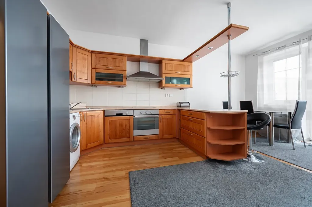 Dispozice bytu je velmi dobře řešená. Dominantou je světlý obývací pokoj s kuchyňským koutem, ze kterého je přímý vstup na balkón s příjemným a klidným výhledem. Kuchyňská linka je vyrobena na míru a je vybavena veškerými spotřebiči.