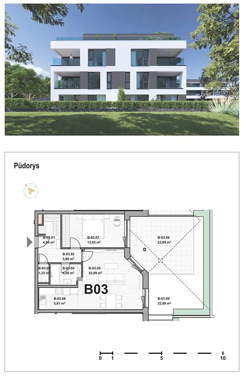 Do této kategorie patří i prezentovaný byt s označením BD4_B03 o dispozici 2+1 s celkovou plochou 108 m² (byt 56,22 m², terasa 23,05 m², zahrada 22,89 m² a sklep 5,85 m²).