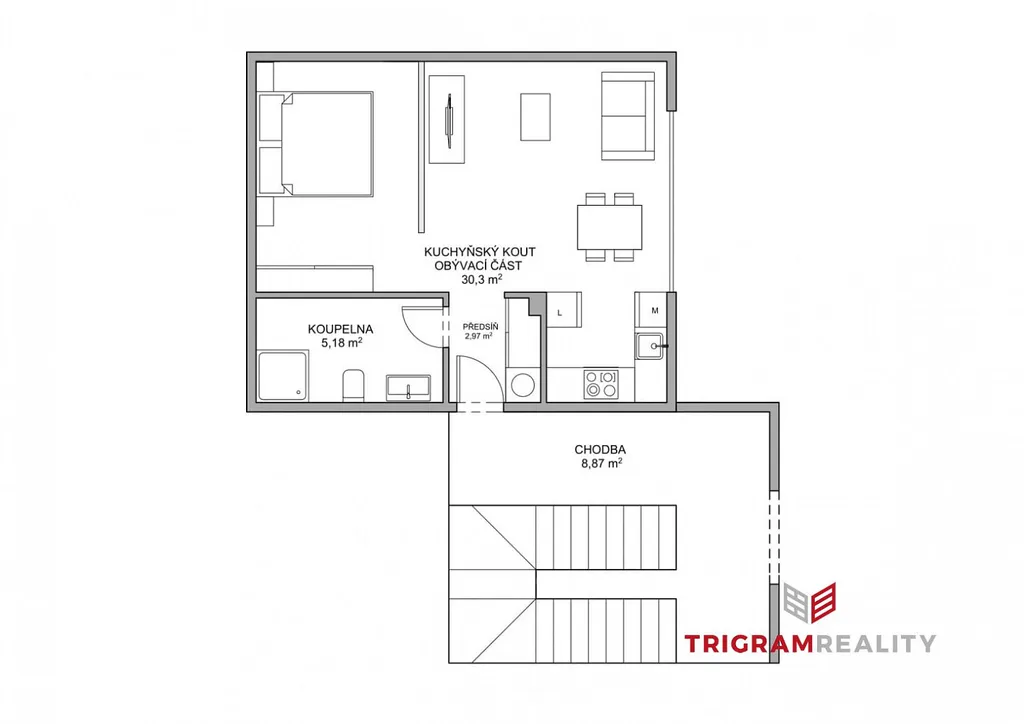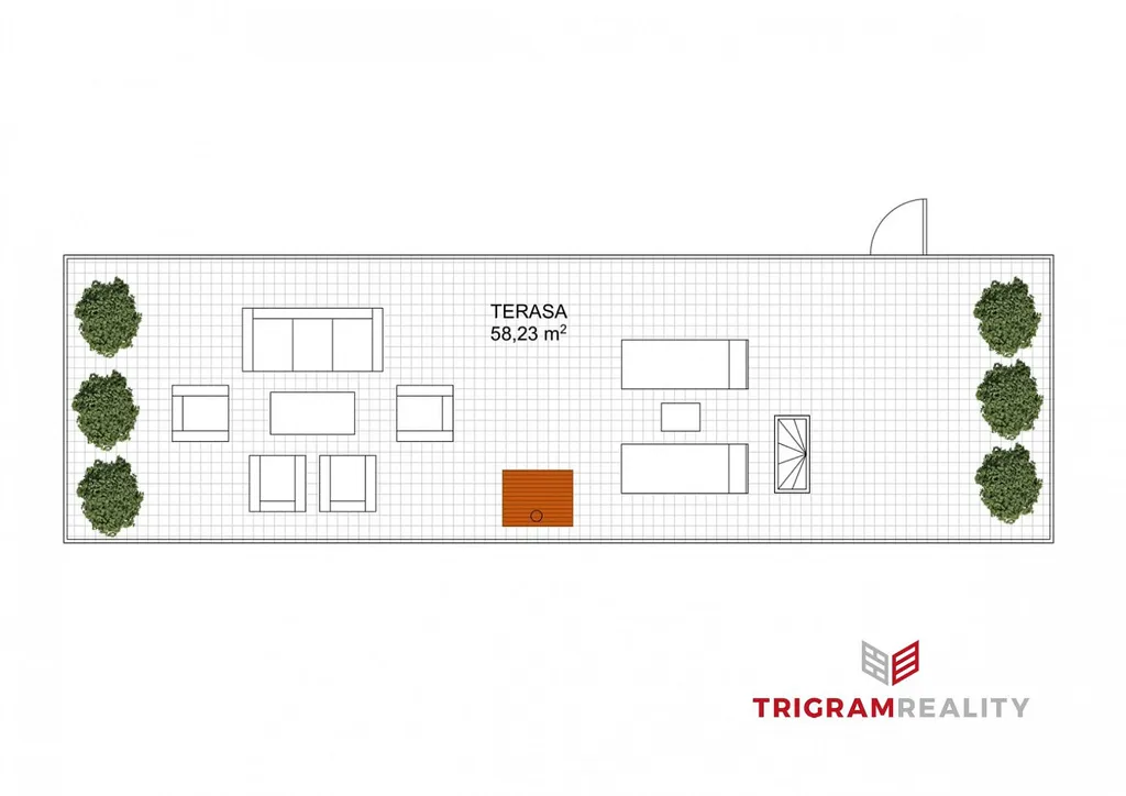 Velkým bonusem tohoto bytu je střešní terasa určena k relaxu či grilování, a je rozdělená opticky na dvě části (cca 30 m² pro každý z bytů), nabízející krásný a ničím nerušený výhled do okolí. Byt je vhodný pro jednotlivce bez dětí a zvířat.