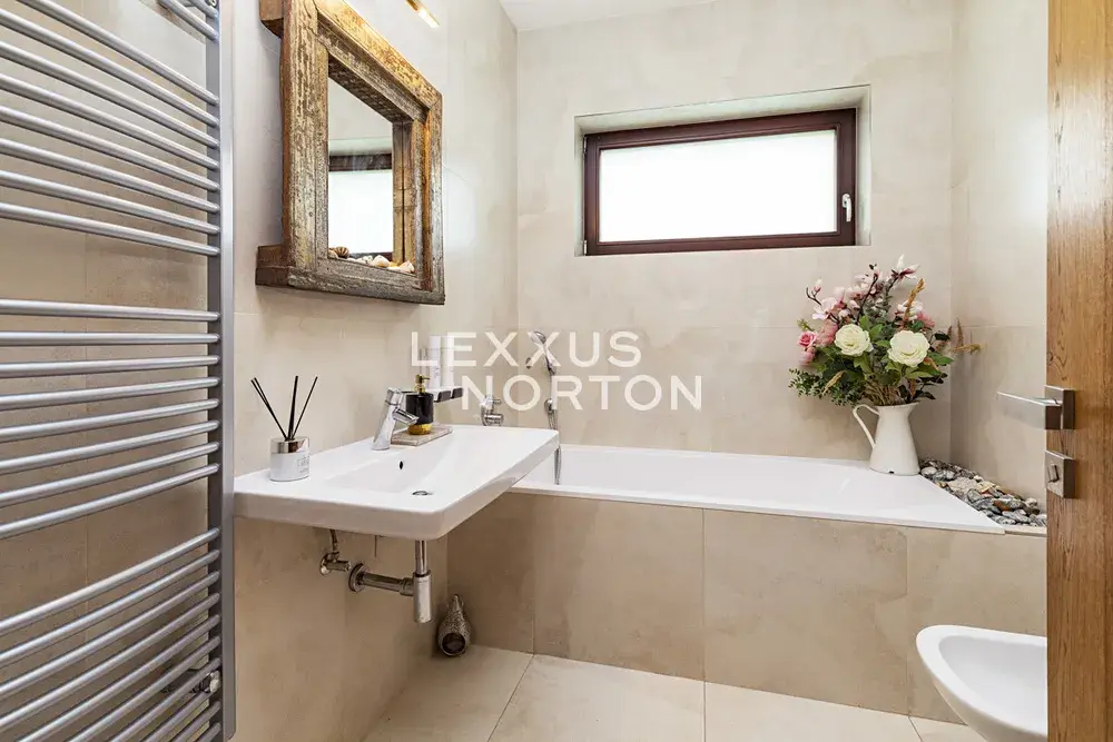 Obytná plocha 190 m2 poskytuje pohodlné bydlení. Interiér se skládá z prostorné vstupní haly, obývacího pokoje s velkými okny, barovým posezením a navazujícím kuchyňským a jídelním koutem. Z obývacího pokoje je vstup na terasu a zahradu. Dále jsou zde dvě ložnice, z nichž jedna má přímý vstup na terasu, dvě koupelny a komoru.