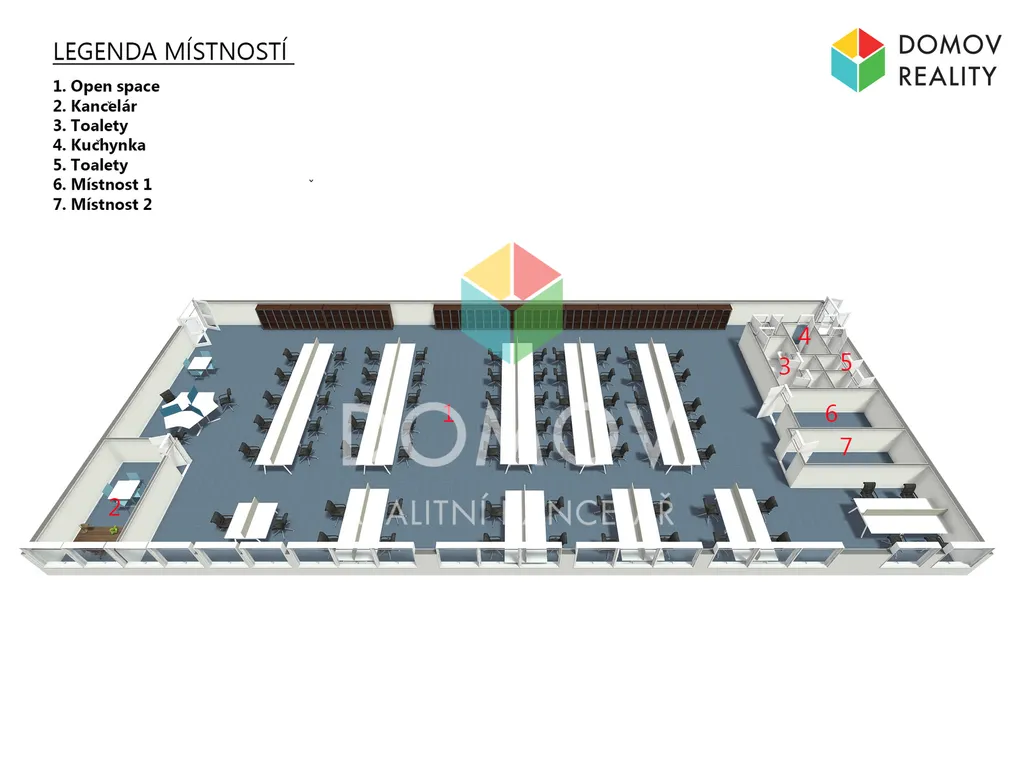 Kanceláře jsou kompletně zařízené kancelářským nábytkem (pracovní stoly, židle), umožňují okamžité zahájení provozu bez dalších investic.