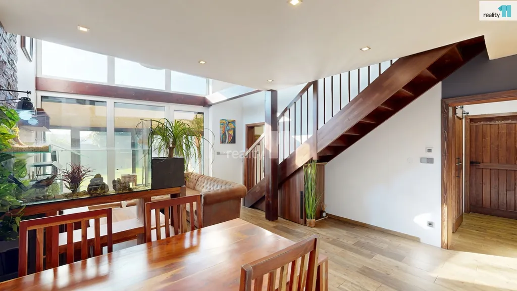 Dvě ložnice a hlavní koupelna s vanou Vás čekají v patře, kam se dostanete po dřevěných schodech. Pokud by nový majitel potřeboval, dá se přistavět ještě další pokoj nad střechu garáže, při jejíž výstavbě se s touto možností počítalo. Dům je plný světla, i díky jedné stěně, která je kompletně prosklená. Jsou zde kvalitní podlahy, obklady i sanitární technika, podlahové elektrické vytápění, klimatizační jednotky. Majitelé nad zařízením důsledně přemýšleli, aby v domě byl dostatek úložných prostor a dál působil pohodlně, takže jsou využity i prostory pod schodištěm a další zákoutí. Zimní zahrada se vstupem na terasu, má přípravu i pro případné umístění krbových kamen. Terasa slouží zejména pro relaxaci, grilování, posezení a rozděluje zahradu na přední a zadní část. Přední část je travnatá s automatickou závlahou, s několika okrasnými keři a slouží zejména pro děti. Zadní část je vydlážděná, vhodná pro parkování, nebo trénink na koš? Je zde také menší technický domek (nemusí zůstat), i když v garáži je opravdu dost prostoru i pro vášnivého kutila.