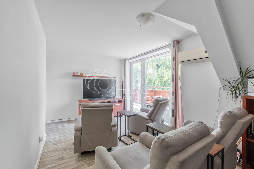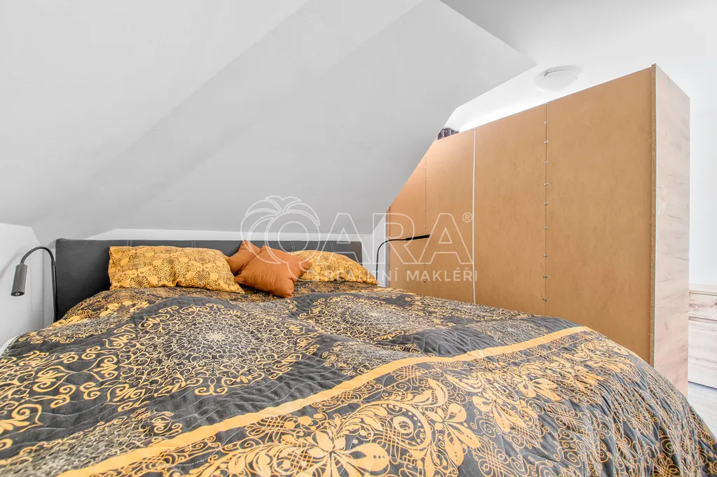 Při vstupu do bytu se z prostorné chodby dostanete na samostatnou toaletu a do moderní koupelny. Dále se byt otevírá do hlavního obytného prostoru, kterým je obývací pokoj s kuchyňským koutem. Z hlavní ložnice je pak stejně jako z ovýváku, přímý vstup na jedinečnou terasu, která je ideálním místem pro ranní kávu i večerní relaxaci. Naproti koupelně se nachází útulný dětský pokoj, ze kterého se po točitých schodech dostanete do podkrovního pokojíčku. Tento prostor je jako stvořený pro domácí pracovnu, ale věříme, že si ho děti na první pohled zamilují a udělají si z něj svůj soukromý koutek.