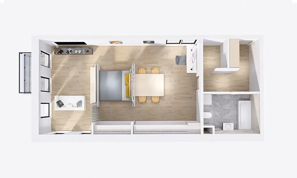 Hlavní obytná část je navržena jako jeden otevřený celek, který je chytře zónován pomocí nábytkové příčky a závěsů. Díky tomu nabízí jasně oddělenou obývací část, spací zónu a kuchyň s jídelním stolem, aniž by prostor působil přeplněně či uzavřeně. Velkoformátová okna zajišťují dostatek denního světla a opticky prostor zvětšují.