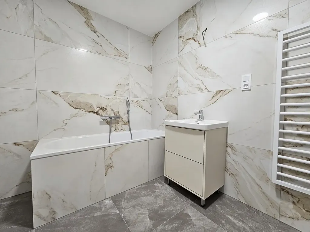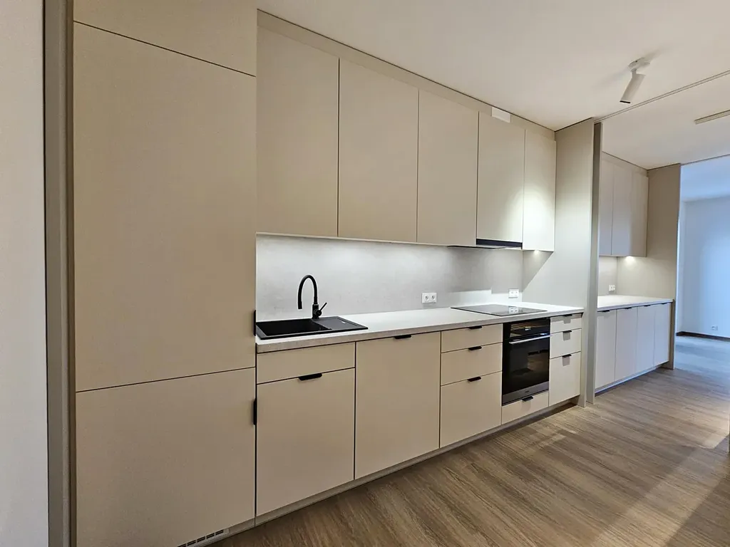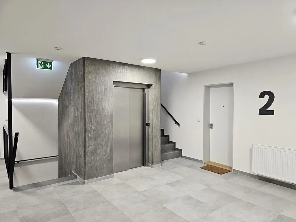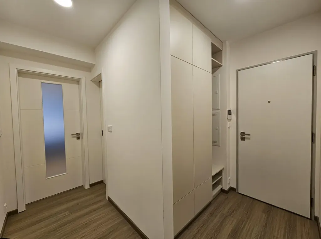 Interiér bytu je proveden podle návrhu architekta. Prostor působí mimořádně vzdušně a nadčasově. Kombinace kvalitně zvolených materiálů a chytrého dispozičního řešení vytváří prostředí, které je nejen esteticky působivé, ale také praktické pro každodenní život. Byt se bude pronajímat částečně zařízený, což výrazně sníží počáteční náklady na nové bydlení. K dispozici bude kuchyňská linka na míru s vestavěnými spotřebiči, vestavěné šatní skříně, umyvadlová skříňka, komoda, jídelní stůl a postel.