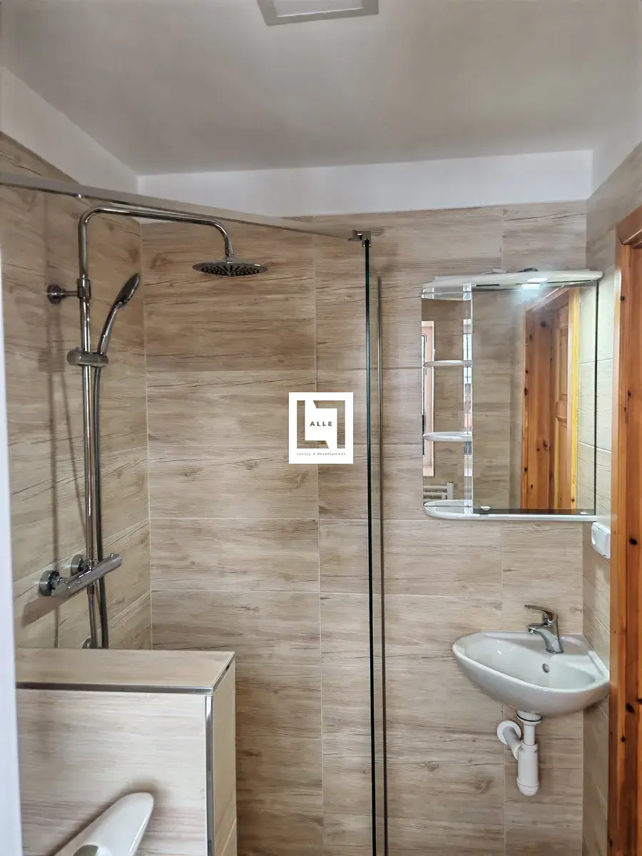 Po schodech postupujete do 1.NP na menší chodbu, kde je umístěno samostatné wc, koupelna se sprchovým koutem a pračkou a následně vchod na dlouhou terasu s výhledem do vnitrobloku se zahradou. Z chodby také pokračujete do velké kuchyně vybavené kuchyňskou linkou s troubou a varnou deskou, digestoří a dřezem. Místnost je průchozí společně s obývacím pokojem do samostatné ložnice.
