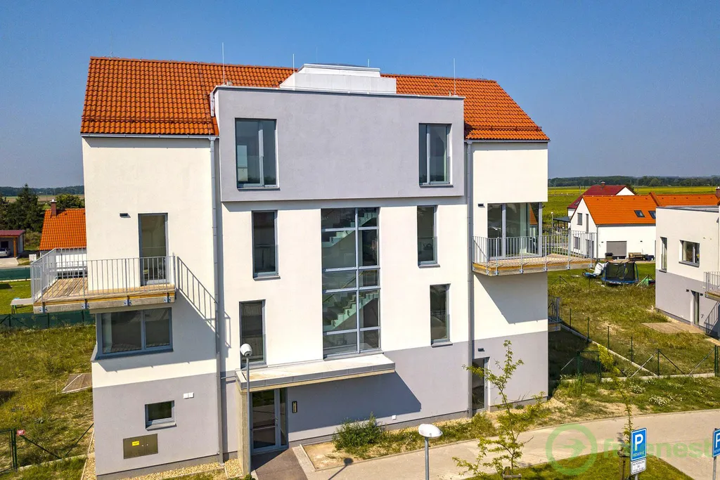 elektřina, vodovod, plyn, kanalizace, metropolitní optická síť. K bytu o čisté obytné ploše 66 m2 dále náleží prostorný balkón o výměře 8,37 m2 a také sklep o výměře 2,37 m2. K bytu náleží vyhrazené parkovací stání přímo před domem (parkovací kartičku vydává na žádost obecní úřad). Bytový dům je zděný, kvalitně zateplený, s centrálním plynovým podlahovým vytápěním a centrálním plynovým ohřevem teplé vody (vše má samostatné měření pro byt s dálkovými odečty). Byt bude vybaven kuchyňskou linkou včetně spotřebičů a velkou vestavěnou skříní v předsíni. Byt bude k nastěhování od 1.3.2026, prohlídky jsou však možné již od 26.1.2026. Nájemné činí 17.000 Kč měsíčně + zálohy na služby 3.047 Kč měsíčně. Elektřina bude přepsána na nájemce (pouze na svícení a běžné spotřebiče). Kauce činí dvě měsíční nájemné. Provize zprostředkovatele činí jedno měsíční nájemné plus DPH.