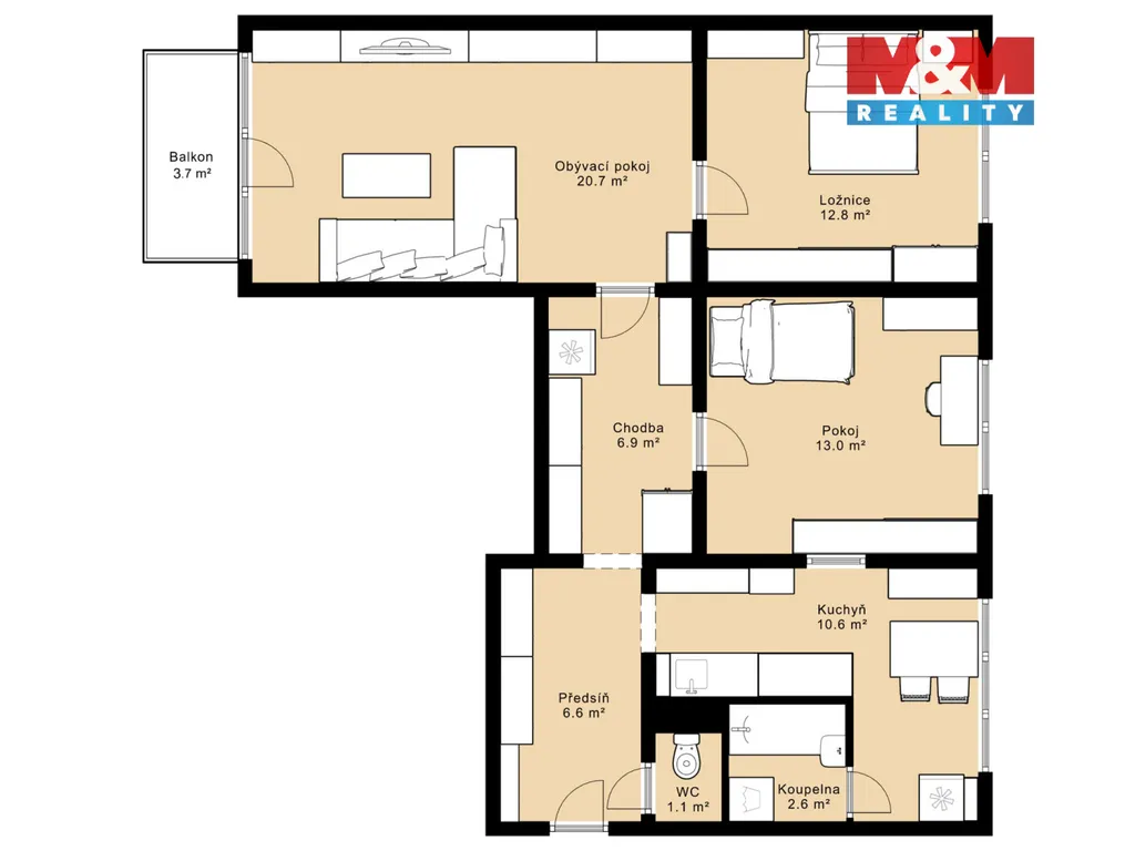 Byt zahrnuje obývací pokoj se vstupem na lodžii, samostatnou kuchyň, ložnici, pokoj, koupelnu, samostatnou toaletu a předsíň.