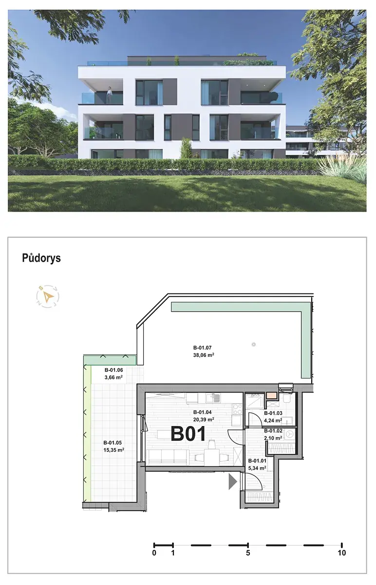 Jednotka B01 sestává z obývacího pokoje s kuchyňským koutem, koupelny s WC, předsíně a šatny. Součástí je i sklepní box v suterénu budovy. K bytu je možné dokoupit také parkovací stání v suterénu domu.