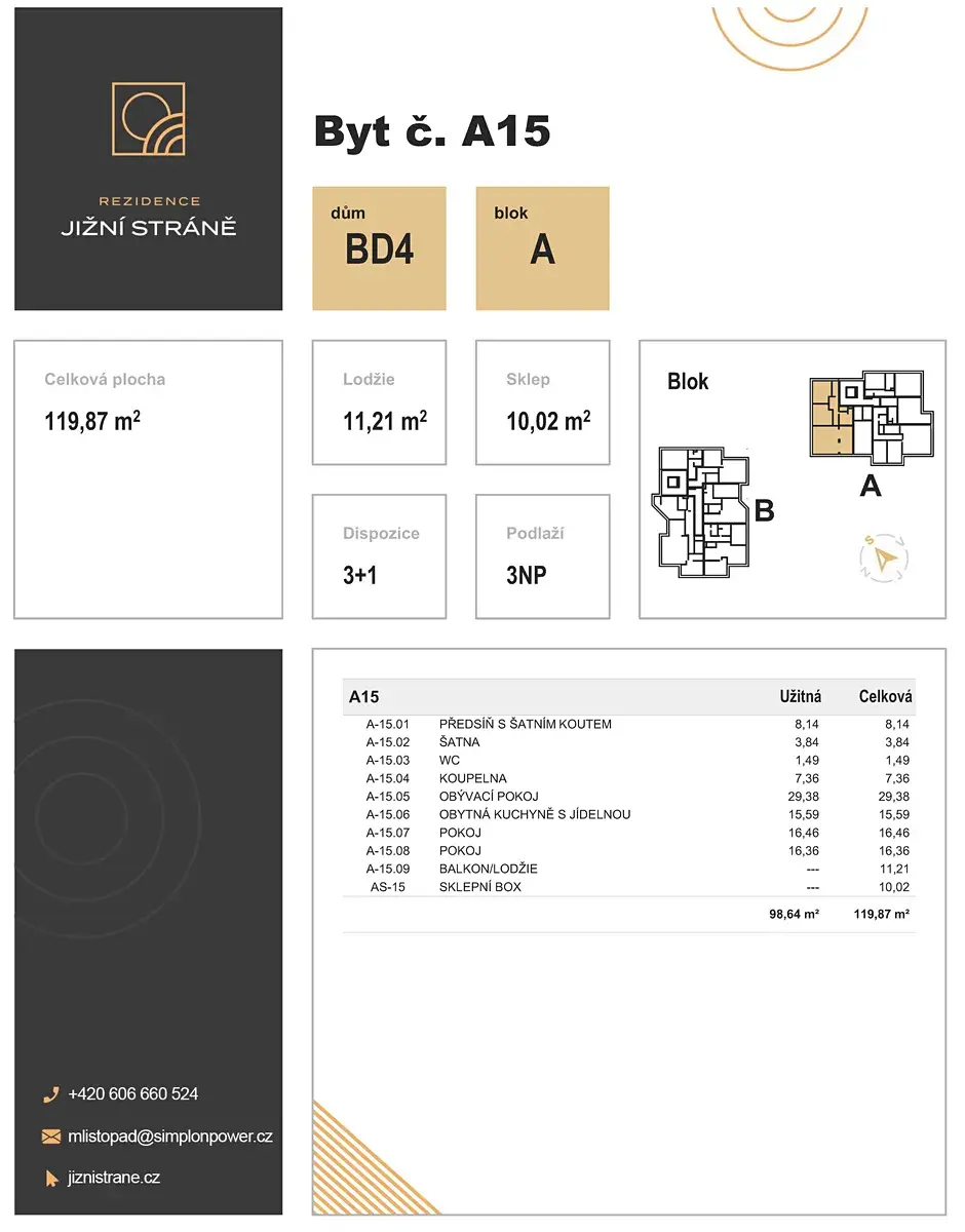 Do této kategorie patří i prezentovaný byt s označením BD4_A15 o dispozici 3+1 s celkovou plochou 119,87 m² (byt 98,64 m², balkon 11,21 m² a sklep 10,02 m²).