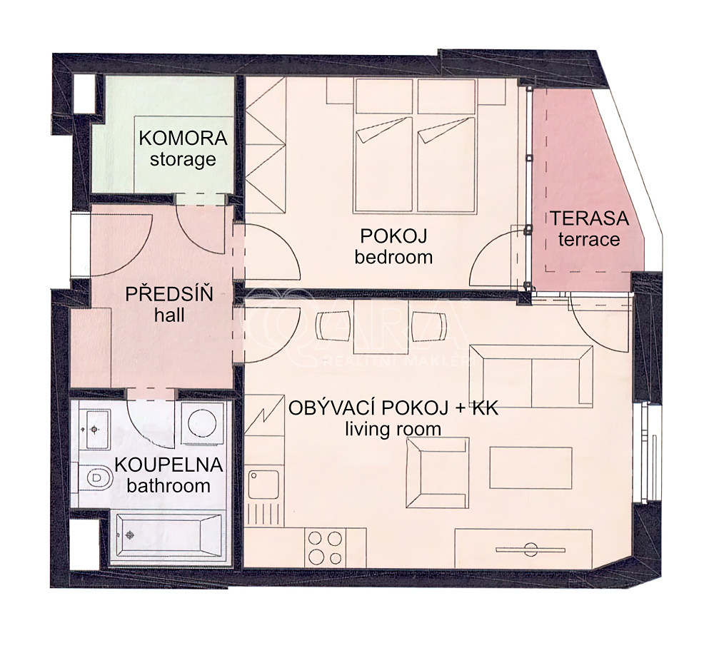 Nabízím k dlouhodobému pronájmu byt 2+kk o velikosti 52,4 m² s terasou (4 m²). Byt je plně vybavený (viz foto). V koupelně se nachází vana a pračka se sušičkou (2 v 1). Součástí bytu je také praktická komora, která poskytuje další úložný prostor. K bytu náleží také sklepní kóje.