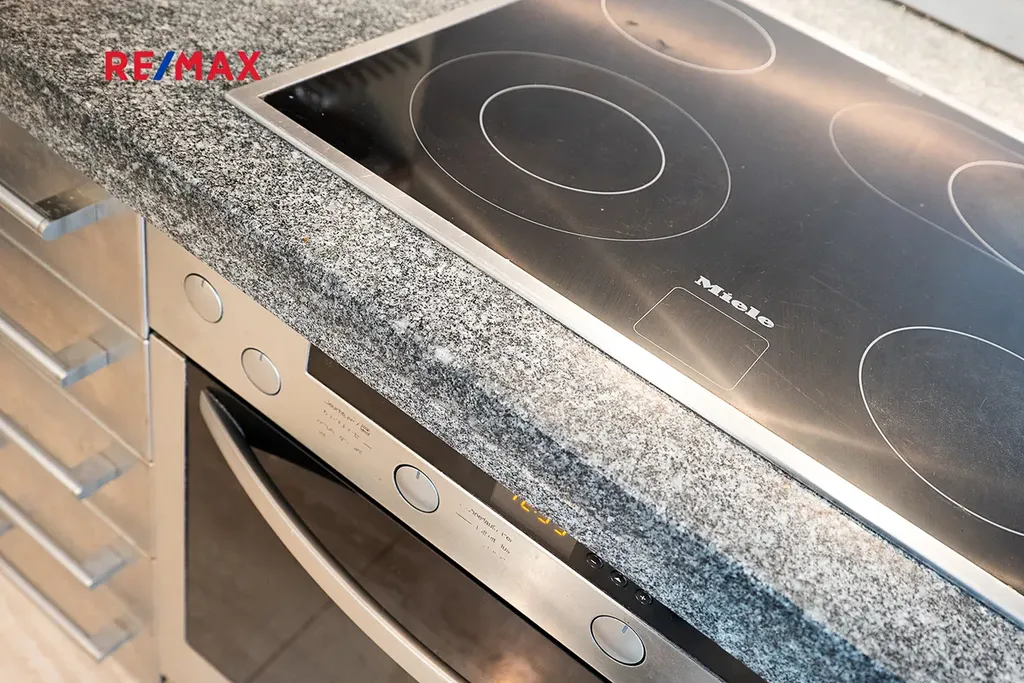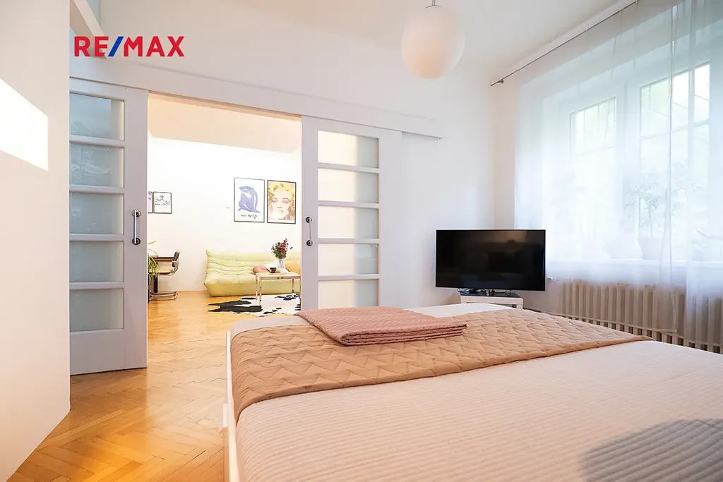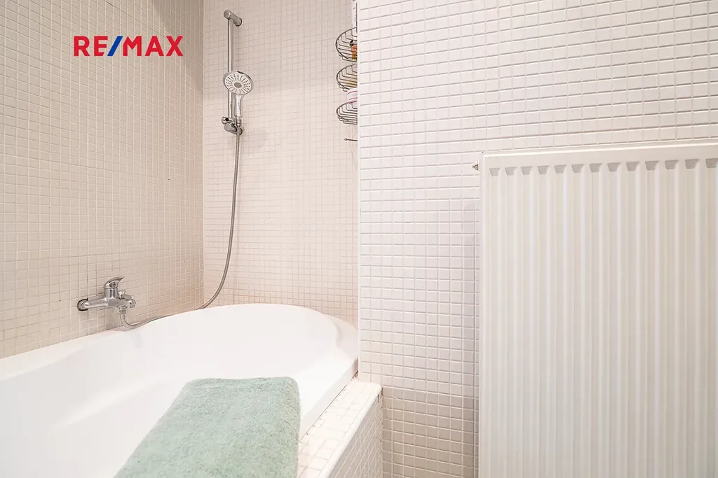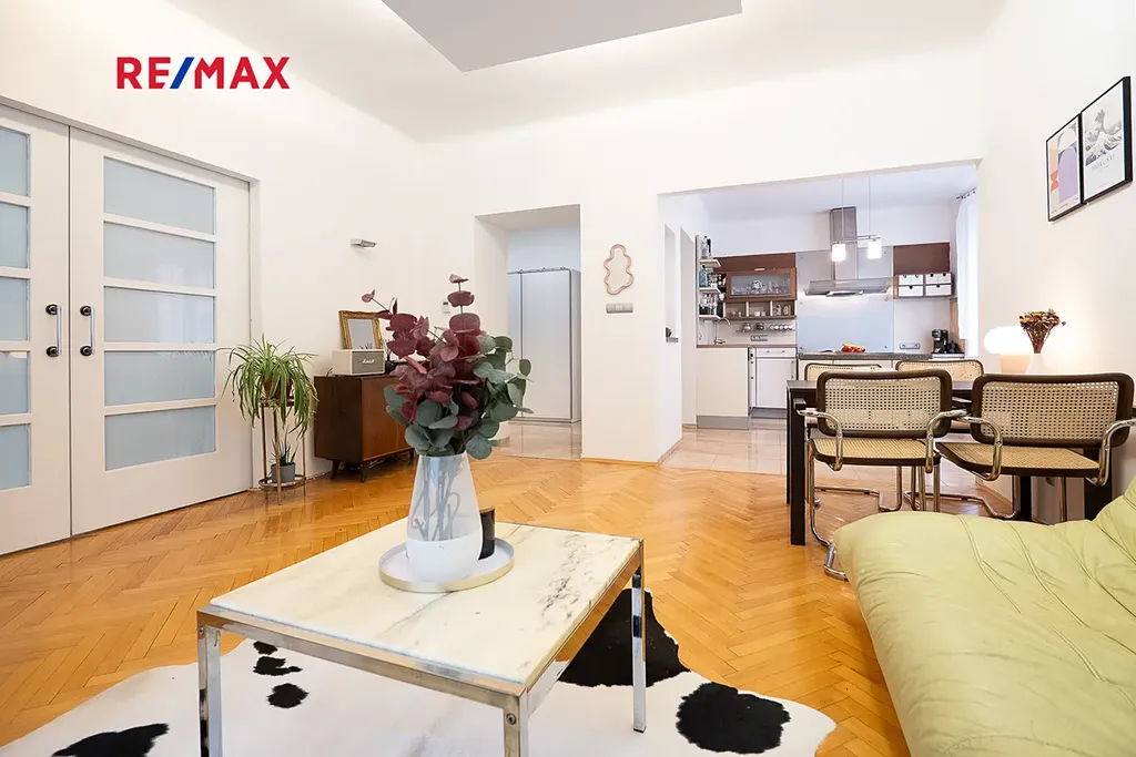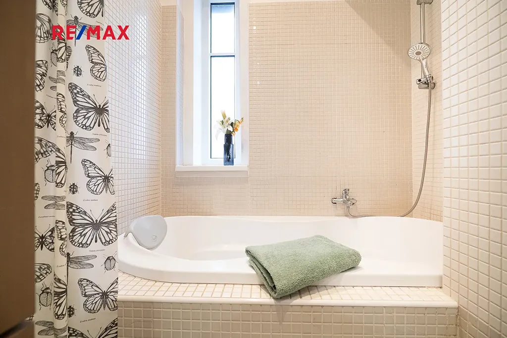 Stylová kuchyňská linka je osazena kvalitními vestavěnými spotřebiči značky Miele. Koupelna je vybavena vanou, pračkou i sušičkou, toaleta je řešena samostatně se závěsným WC. Byt prošel kompletní a citlivou rekonstrukcí zahrnující nové rozvody elektřiny, vody i plynu, moderní osvětlení, kvalitní parketové podlahy v obytných místnostech a dlažbu v předsíni a koupelně.