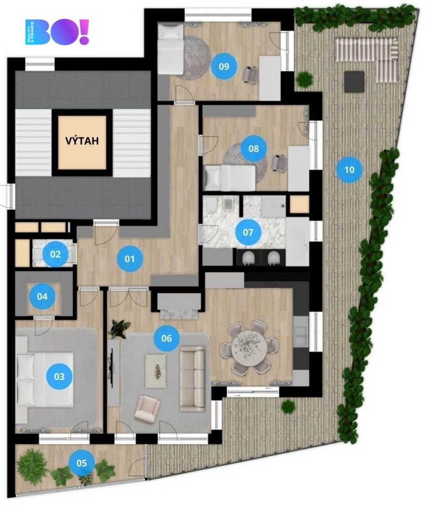 Byt 134,2 m² s treasou 65,16 m² a sklepem 4,37 m² je šikovně dispozičně řešen tak, aby nabízel dostatek prostoru pro komfortní bydlení.