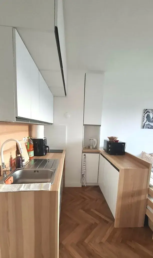 Byt se nachází v 6. (předposledním) patře, má celkovou plochu 31 m2 + sklep. Pokoj s kuchyňským koutem je velký přibližně 18 m2, ostatní plochu tvoří koupelna, samostatné WC, balkón a prostorná předsíň s nikou. K bytu také náleží sklepní kóje v suterénu domu, velká cca 3 m2. Vlastník bytu může také využívat společný dvůr a zahradu za domem.