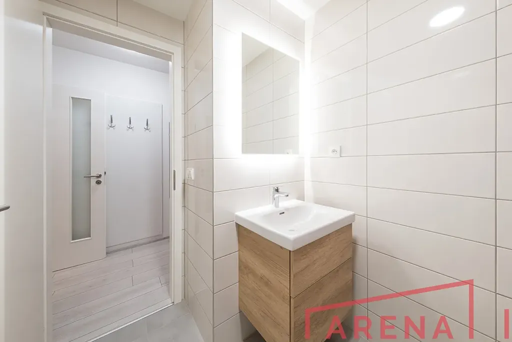 Koupelna nabízí prostorný sprchový kout, umyvadlo, závěsné WC a elektricky vyhřívaný žebřík. V celém bytě je podlahové vytápění, ohřev vody je centrální. Okna orientovaná na východ jsou osazena elektricky ovládanými screenovými roletami, které zajišťují komfort i soukromí.