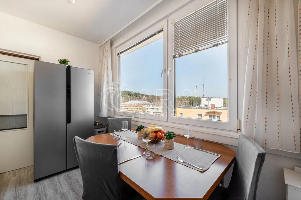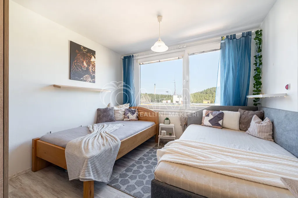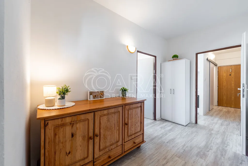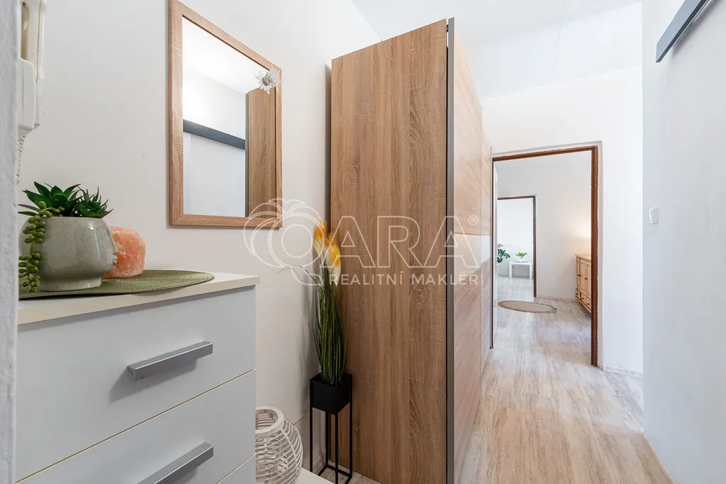 Byt se nachází v posledním patře a disponuje vstupní chodbou, koupelnou se sprchovým koutem a WC, zrekonstruovanou kuchyní, obývacím pokojem a ložnicí s šatnou. Byt je vytápěn dálkově, stejně tak i ohřev vody. K bytu dále náleží prostorný sklep, který je možné využít ke skladování. Společná kolárna a sušárna se nachází v přízemí domu. Úklid společných prostor se řeší rozpisem služeb.
