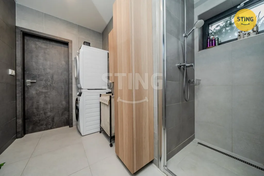 • Koupelna: Moderní design se sprchovým koutem a oknem pro přirozené světlo a větrání. WC je samostatné.