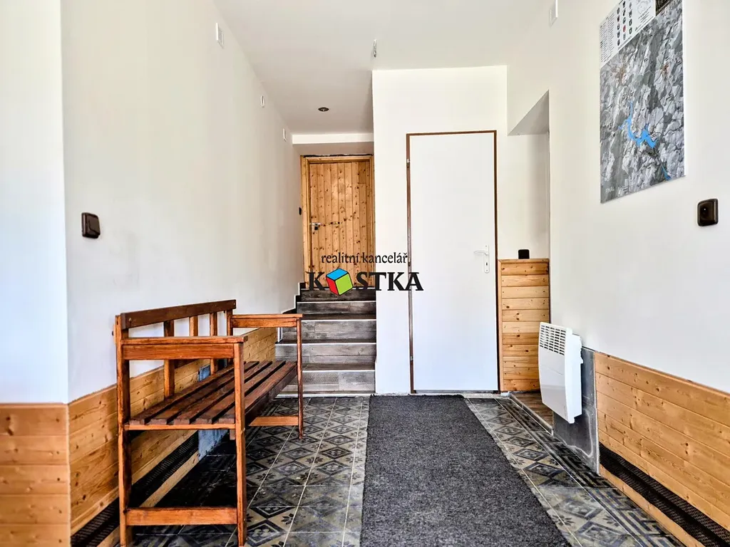 Příjezd k domu je po asfaltové komunikaci, Hned za branou je parkovací místo a malá předzahrádka s možností posezení a prostorem pro hry dětí. Po vstupu do domu je malá vstupní chodba s průchodem na zastřešenou terasu za domem (večerní posezení ve stínu a možná i grilovačka). Po pravé ruce najdete prostor dříve využívaný jako přípravna s malým skladovým prostorem (původně zde majetel provozoval malé podnikání - nový pokoj s příslušenstvím?). Přímo naproti vchodu je toaleta a technická místnost. Nalevo je velký obývací pokoj s kuchyňským koutem a schodištěm do podkroví. Pod střechou jsou dvě velké ložnice, mezi nimi společný prostor. A nakonec je v podkroví prostorná koupelna se sprchovým koutem, umyvadlem a toaletou. Na pozemku před domem je skladovací prostor využívaný jako kolárna.