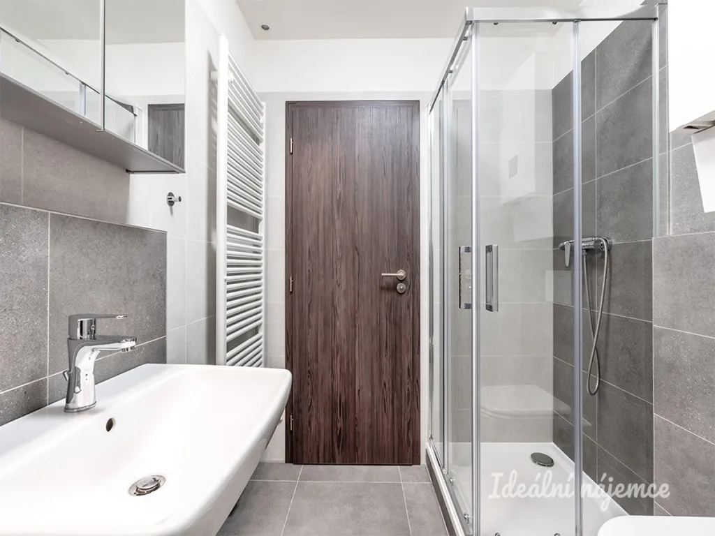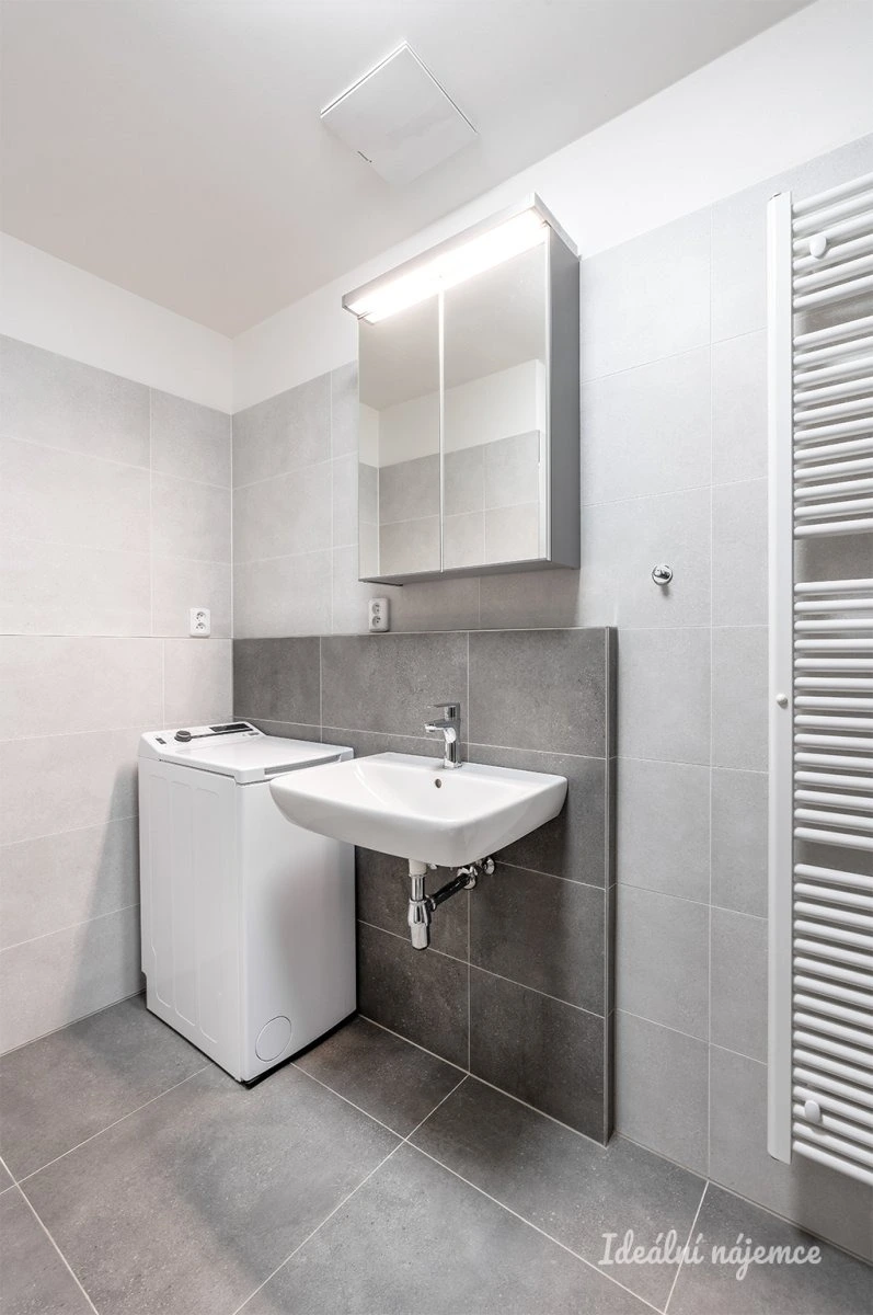 Byt se nabízí částečně vybavený - kuchyně disponuje myčkou nádobí, elektrickou troubou, indukční varnou deskou a digestoří. Obývací část se pronajímá nezařízená. Podlahy jsou zde vinylové. V koupelně nalezneme sprchový kout, umyvadlo se skříňkou a pračku. V předsíni se nachází šatní skříň.