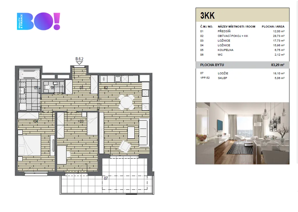 Byt o podlahové ploše 83 m² s lodžií 18 m² je šikovně dispozičně řešen tak, aby nabízel dostatek prostoru pro komfortní život.