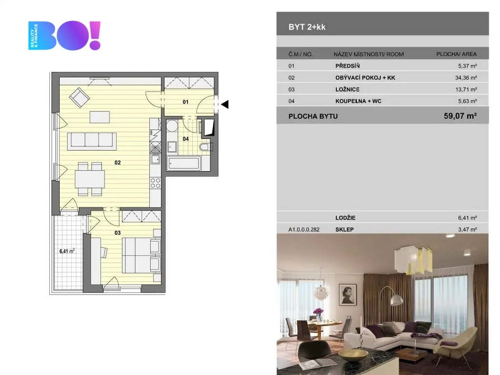 Byt o podlahové ploše 59 m² s lodžií 6 m² je šikovně dispozičně řešen tak, aby nabízel dostatek prostoru pro komfortní život.