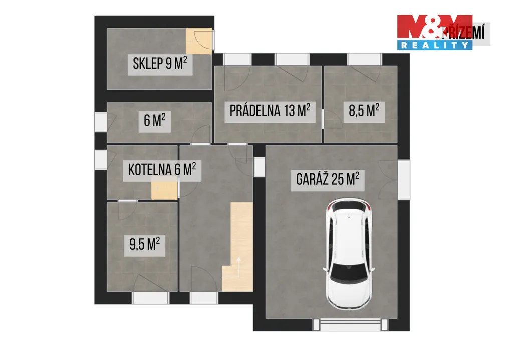 V přízemí se nachází prostorná garáž a technické zázemí s průchodem do zahrady, kde je k dispozici zděná pergola.