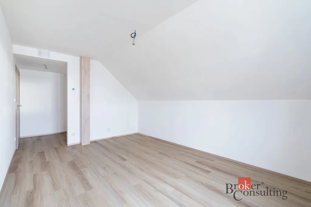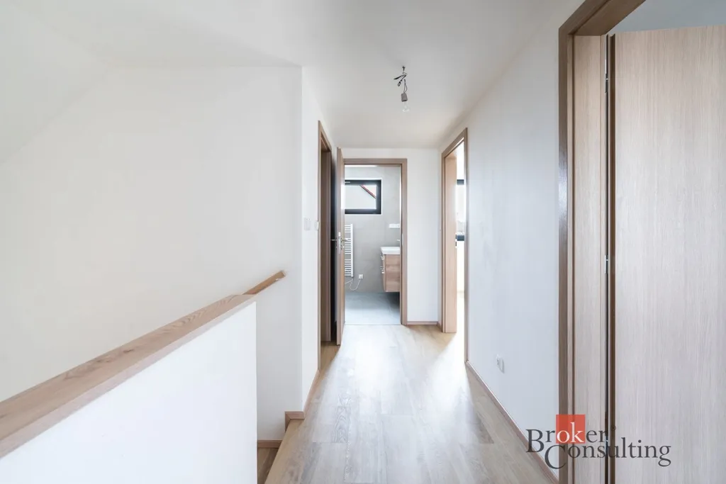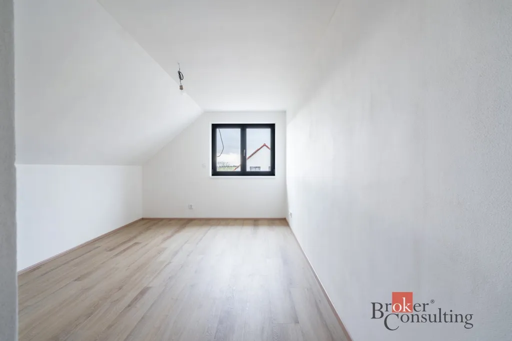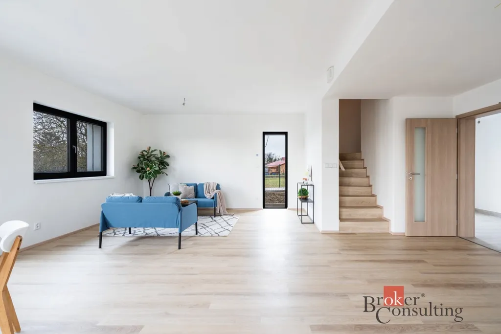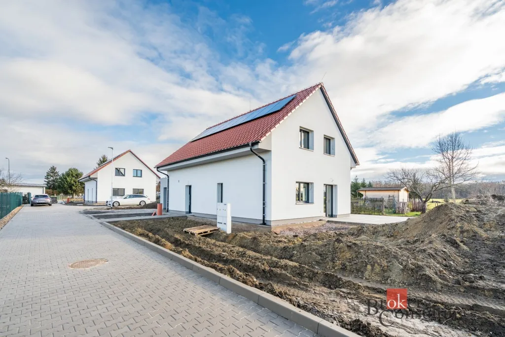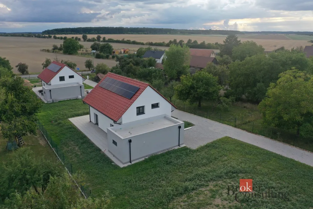 Jedná se o zděnou stavbu (Ytong) se dvěma nadzemními podlažími. Tato novostavba o dispozici 5+kk se nachází na pozemku o rozloze 723 m², přičemž celková plocha domu činí 164,8 m². V přízemí se nachází prostorný obývací pokoj spojený s kuchyní (41,1 m²) a vstupem na terasu (40 m²), dále je zde místnost, která může sloužit jako pokoj pro hosty či pracovna (11,8 m²), koupelna se záchodem (4,6 m²), technická místnost (2,9 m²) a ještě jedna menší místnost pod schody (4,0 m²). V prvním patře jsou dva pokoje s vlastní šatnou (17,8 m² a 16,0 m²), dále ložnice (16,0 m²) se samostatnou šatnou (3,0 m²) přes chodbu a také druhá koupelna (6,1 m²). Jistě také oceníte pudní prostor o velikosti cca 40 m².