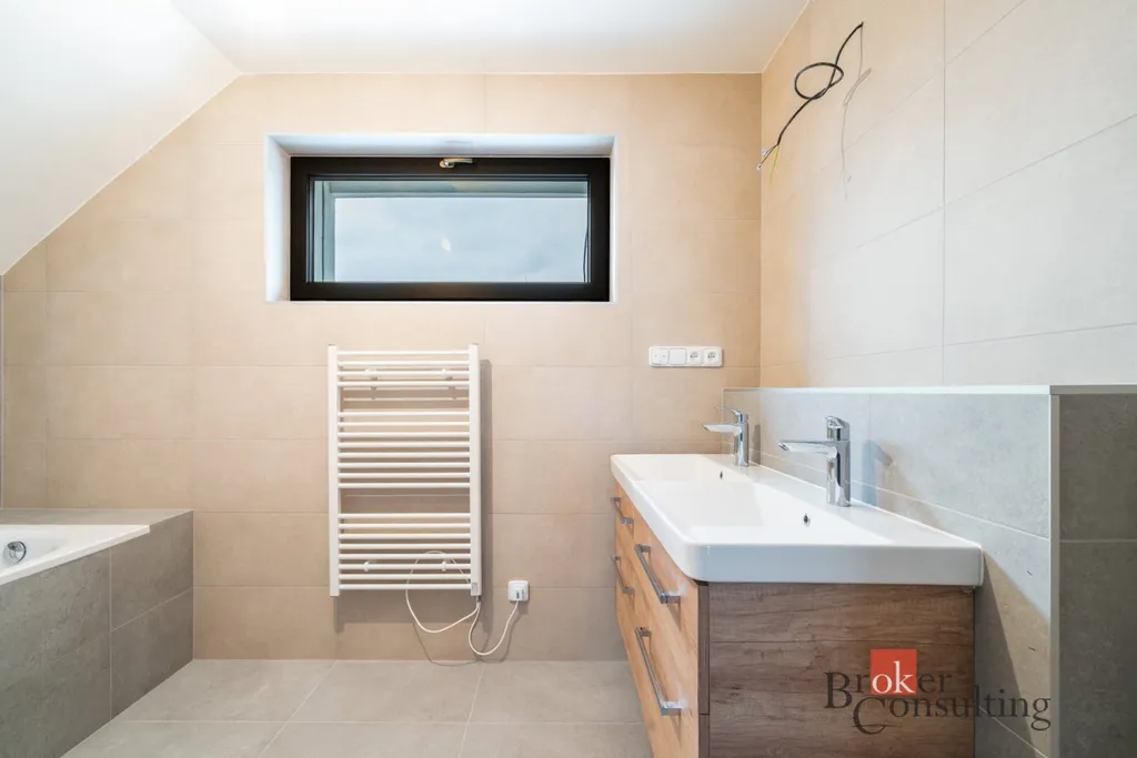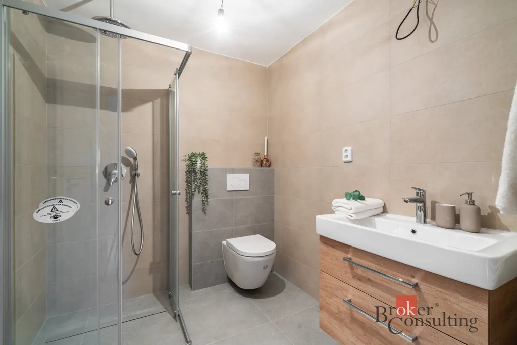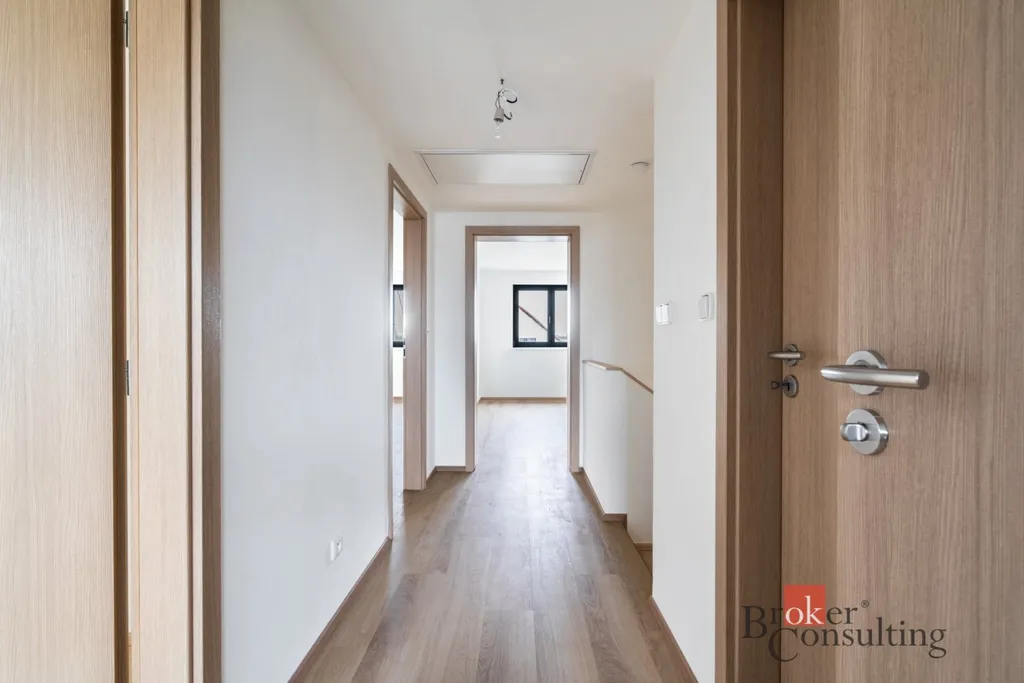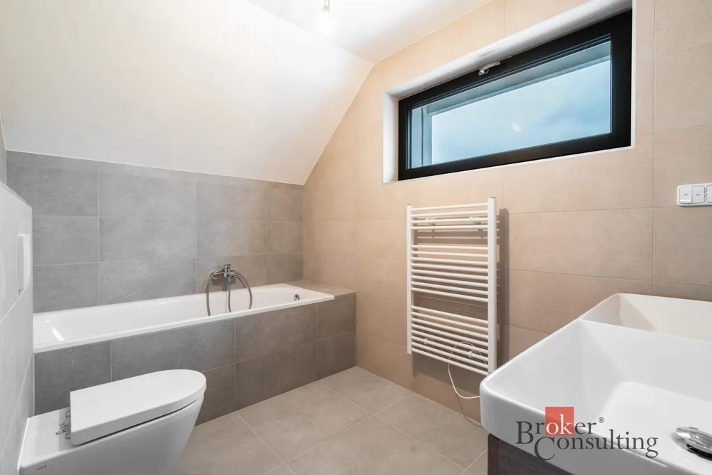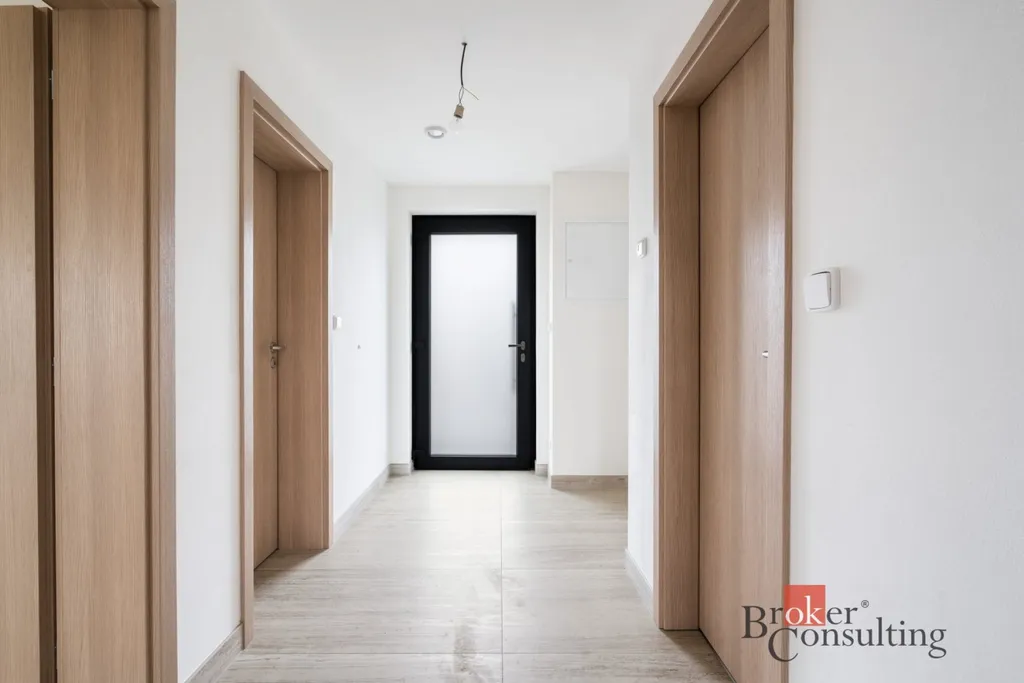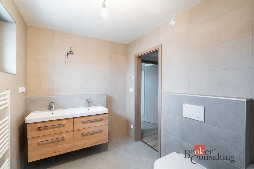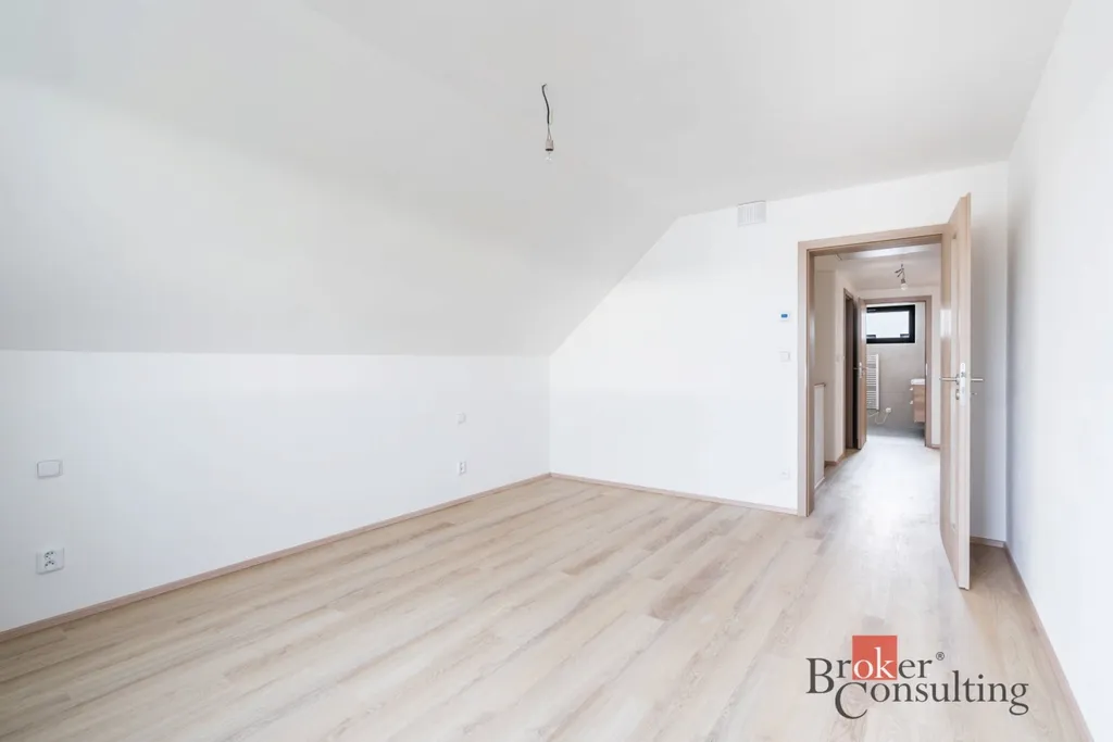 Jedná se o zděnou stavbu (Ytong) se dvěma nadzemními podlažími. Tato novostavba o dispozici 5+kk se nachází na pozemku o rozloze 723 m², přičemž celková plocha domu činí 164,8 m². V přízemí se nachází prostorný obývací pokoj spojený s kuchyní (41,1 m²) a vstupem na terasu (40 m²), dále je zde místnost, která může sloužit jako pokoj pro hosty či pracovna (11,8 m²), koupelna se záchodem (4,6 m²), technická místnost (2,9 m²) a ještě jedna menší místnost pod schody (4,0 m²). V prvním patře jsou dva pokoje s vlastní šatnou (17,8 m² a 16,0 m²), dále ložnice (16,0 m²) se samostatnou šatnou (3,0 m²) přes chodbu a také druhá koupelna (6,1 m²). Jistě také oceníte pudní prostor o velikosti cca 40 m².