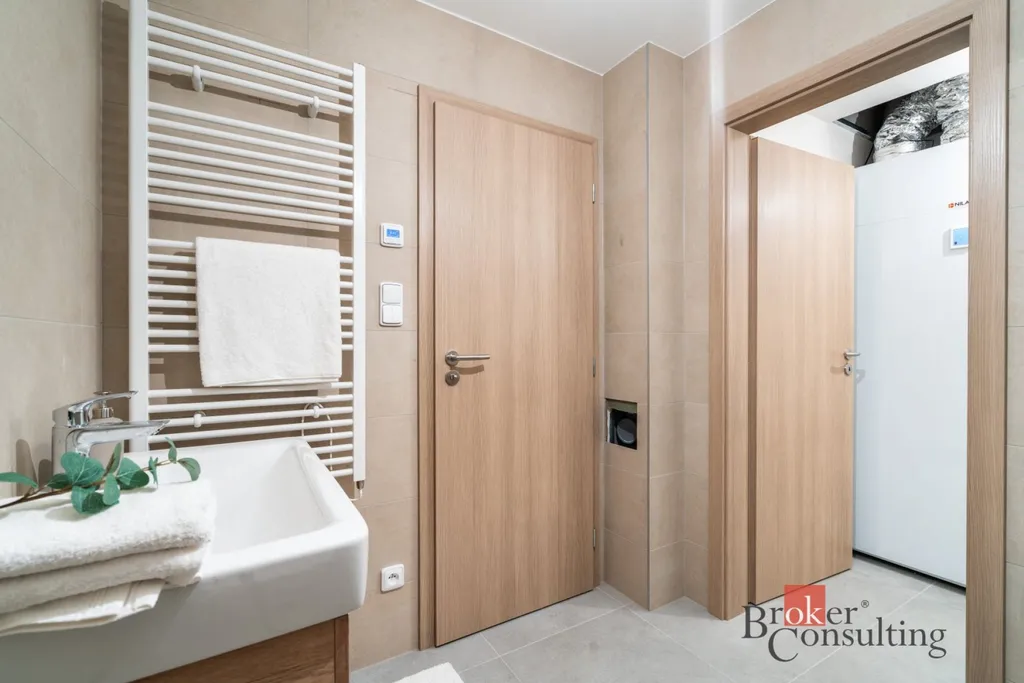 U domu se nachází také prostorná garáž se skladem zahradního nářadí (28,5 m²), kde je uložena technologie FVE a příprava pro bateriové úložiště.